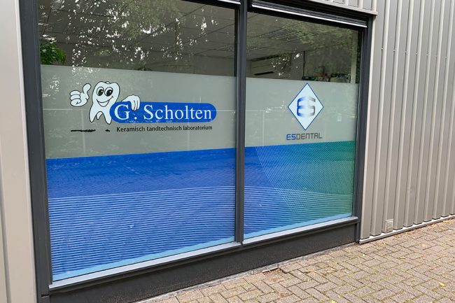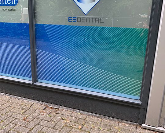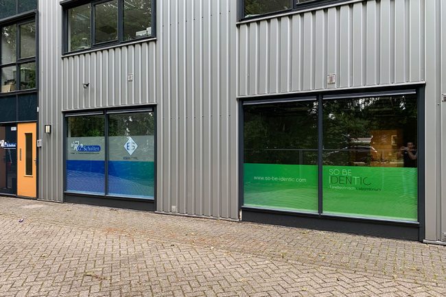 De klant vroeg ons een aansluiting te maken tussen de twee partijen die in het pand werkzaam zijn. Met een verloop en een lijnenspel hebben we deze op elkaar aangesloten. In een ruimte was extra privacy noodzakelijk. Deze hebben we gecreëerd doormiddel van een etched glassstrook boven de kleurfolie.
